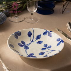 蓝色的植物图案轻松细腻,肌理感丰富,仿佛是餐桌上的一道风景线。被日本政府认定为“日本传统工艺品”的美浓烧陶瓷,特色鲜明、样式精美、使用安心。
