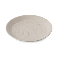 陶艺家塚本快示(1912-1990)深为定窑白瓷魅力吸引,形成了自己端严雅丽的创作风格。他所创立的快山窑美浓烧瓷器薄胎薄釉,胎土雕花富有立体感。牡丹代表着富贵、浓情。