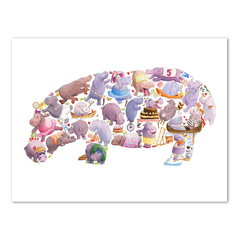 英国 Louise Tate Illustration彩色插画河马500mm*400mm,英国画家 Louise Tate的组合画系列设计新颖,富有想象力和创造力,看似一只大河马,里面却包含了25只小河马、2个蛋糕、3条马鞭、4个球等,内容生动有趣,很有观赏价值和收藏价值。
