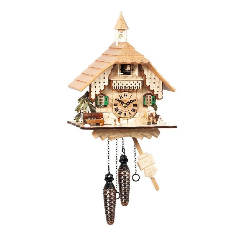 1.德国黑森林布谷鸟钟原装进口,高品质石英机芯;2.小木屋造型,精细雕刻,构成宁静的田园生活;3.整点时,布谷鸟推门而出,清脆报时;4.包含12首优美音乐可选;4. 木质表盘和指针,精细雕刻,古朴大气;5.动力来源于电池,松果造型重锤,既是布谷鸟钟的动力来源又是经典装饰。