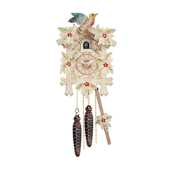 1.德国黑森林布谷鸟钟原装进口,高品质石英机芯;2. 雕刻布谷鸟钟,象征幸福的彩虹鸟,纹理清晰,刻画大气的装饰花纹; 3.整点时,布谷鸟推门而出,清脆报时; 4. 木质表盘和指针,精细雕刻,古朴大气;5.动力来源于电池,松果造型重锤为经典装饰。