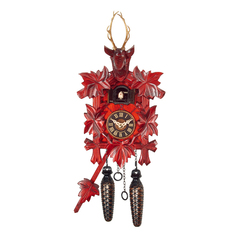 1.德国黑森林布谷鸟钟原装进口,高品质石英机芯;2. 雕刻布谷鸟钟,精细的羚羊及其尖角,纹理清晰,刻画大气的装饰花纹,红、蓝、白三色可选; 3.半点或者整点,布谷鸟推门而出,清脆报时;4.Engstler石英音乐钟包含12首优美音乐可选;5. 木质表盘和指针,精细雕刻,古朴大气;6.动力来源于电池,松果造型重锤为经典装饰。