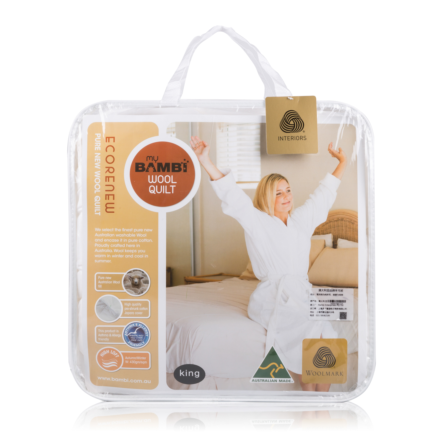 1.澳洲高品质羊毛填充,产地优良。2.全棉被套,保暖舒适、吸湿保干、蓬松柔软不板结。3.精细的绗缝工艺,全流程澳洲制造,经久耐用。