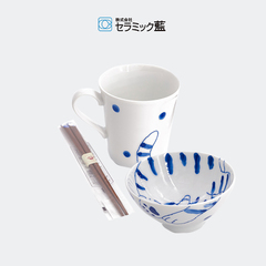 日本原产ceramic 蓝杯碗筷礼盒套装三件套亲密猫系列