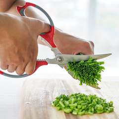 1、10cm长刃,掏鱼肚、剪鸡排等轻松处理大块食材; 2、28度弯刃,处理简单的易滑食材; 3、130度开合角度(可调节),掏鸡肚等处理超大块食材; 4、锯齿设计,轻松刮鱼鳞,易防滑; 5、多功能设计,用途广泛,可以开核桃,开啤酒盖等;
