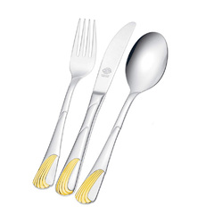 1.采用18/10不锈钢材质,抗腐蚀、抗氧化性能好,材质本身化学性能稳定,不会影响食物本身的营养与口感。2.时尚镀金图案,精致翻页,立体雕花设计,提升餐具档次。3.经久耐用、不易刮花、不易粗钝;