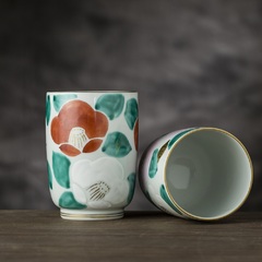 日本Kayori手工京烧清水烧彩绘白椿陶瓷长形茶杯