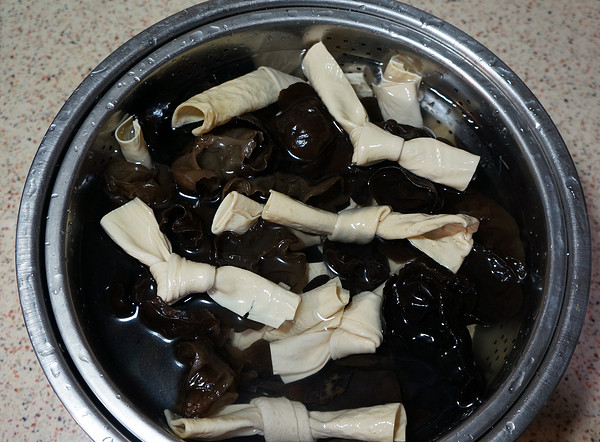 2、配菜用的腐竹和黑木耳,都是干货,使用之前充分泡发,并清洗干净。