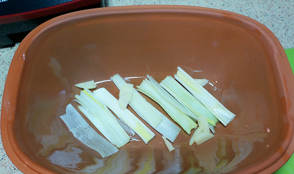 5、切一些葱和蒜,葱如图这样切段再剖开切两片。然后把烤锅捞出来,把葱段均匀的铺在底部。