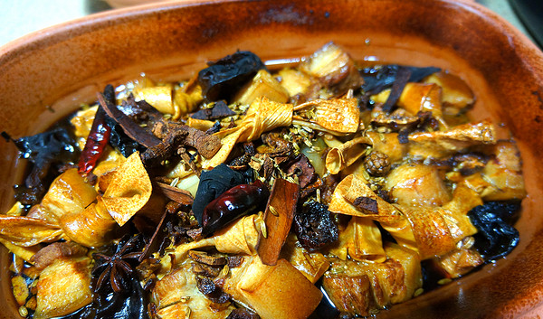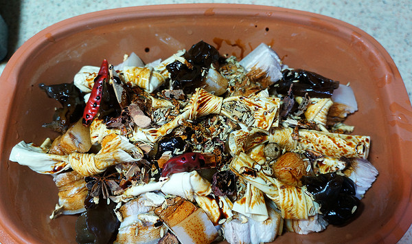 备注(这一步是我思考的结果,比较重要。我们这次用的香料,一开始不是放在烤锅底部或者用无纺布袋扎起来或者是和食材混合均匀的,而是把它们撒在食材们的上方。在烤箱里使用烤锅,等于是全方位受热的。思考之下,绝对把整个烹饪过程分成两个部分,总共两个小时的烹饪时间,前一个小时是第一阶段,我需要利用锅盖的温度,把香料们好好的“烤”一下,彻底激发出他们的香气。)