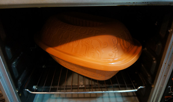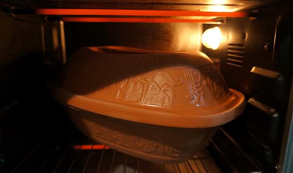 10、把烤锅放入烤箱、盖好盖子,设定上下管温度230度,时间120分钟开始。