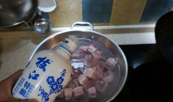 4、然后起一锅冷水,把肉块放进去,再加少许白酒(1公斤肉加20-30ml即可),然后滚沸后煮5分钟。