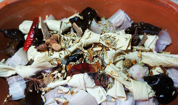 配料:白酒20ml、黄酒一瓶、葱、蒜、姜、生抽、老抽、冰糖、香料包(传统的十香)