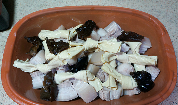 6、依次铺上一些木耳、腐竹、焯过水的洗干净的肉块。