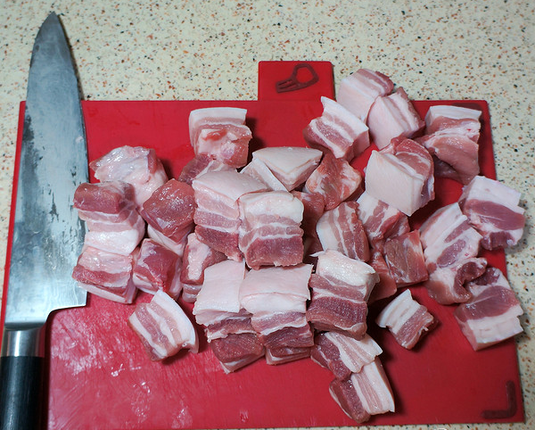 14、肉块被翻动之后,沾染了锅底的汤汁和油脂,瞬间变得红润鲜亮了起来,从肉块的形态可以看出,这么小的肉块也已经出现了“吊脚”,说明多余油脂已经析出,而肉皮已经相当软糯。