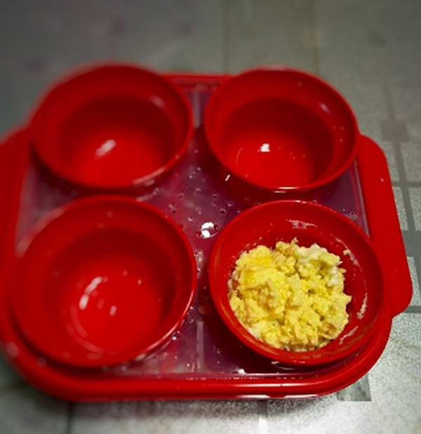 共四个拳头大小的碗,每个正好可以放下一个鸡蛋的量,根据自己的爱好加些水、调料,稍稍搅拌下,放到微波炉里两三分钟就完美出锅啦,一点也不烫,容器只是稍暖些。