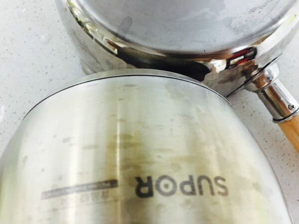 上图也可以看到随着使用次数增加不锈钢锅都出现变色的现象(注:图中苏泊尔锅与雪平锅均是已经仔细清洗过后的)