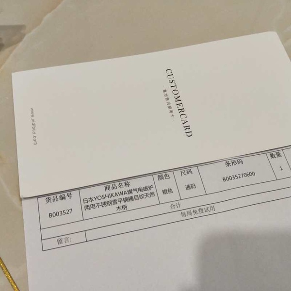 随锅附带了一张使用说明和喜地售后服务卡,使用说明主要说了一些使用中遇到的问题怎么样bla bla bla,其中里面有讲到锅子使用中发生变色其实是金属特性不用担心,火不要开得太大不然会不小心烫伤等等,其实还是有用的,还是建议看看。